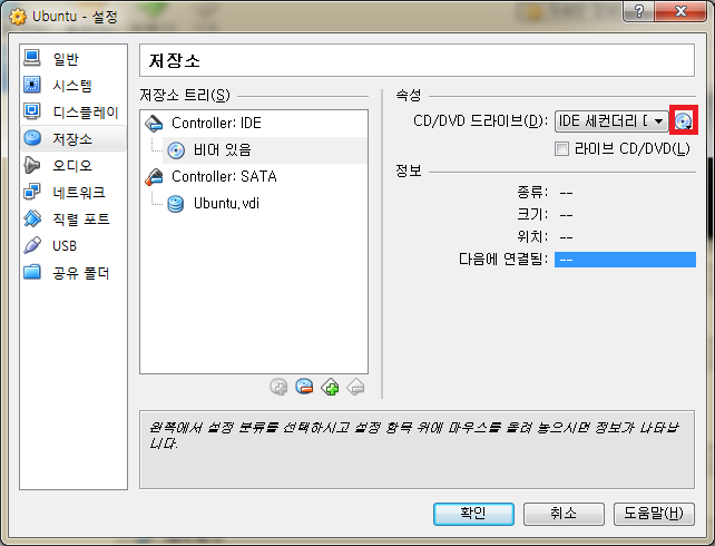 - CD 모양 아이콘을 클릭 한후, 다운 받은 ubuntu iso 파일을 넣는다.
