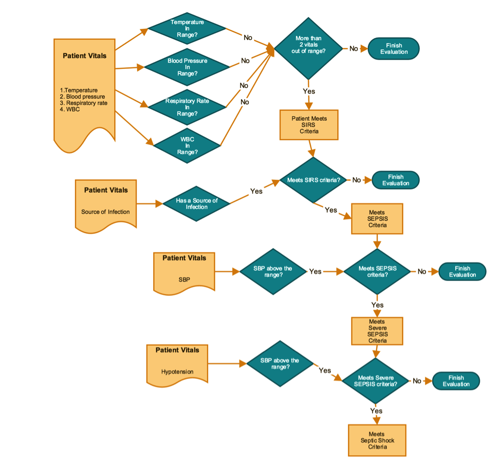 - 환자가 SIRS 기준에 부합하게 되면 즉시 sepsis, severe sepsis, septic shock등을 순서대로 체크해야한다. 이 평가 프로세스의 flow chart는 다음과 같다.