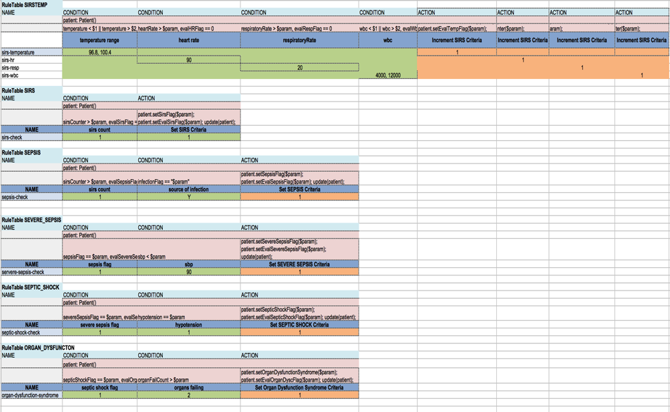 - 다음은 sepsis calculator를 충족시키기 위해 만들어진 decision table이다.