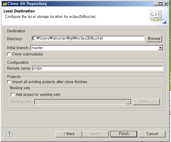 $git remote add origin https://lahuman:패스워드@bitbucket.org/lahuman/eclips2bitbucket.git