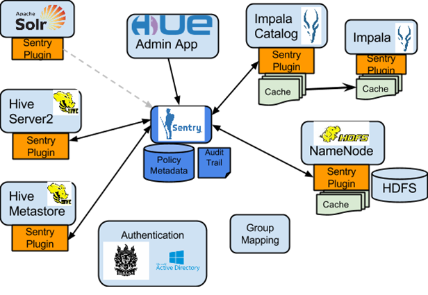 Sentry는 사용자를 식별하기 위해서 Kerberos나 LDAP과 같은 기존 인증 시스템을 활용합니다. 이와 같은 전용 인증 시스템을 활용하면 Sentry는 다른 하둡 에코시스템에 매핑된 동일한 그룹 정보를 Sentry가 활용할 수 있다는 것을 의미합니다.