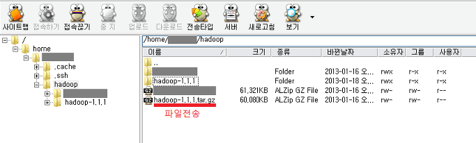 알FTP로 전송한 hadoop-1.1.1.tar.gz가 있는 위치로 이동하여 tar파일의 압축을 푼다.