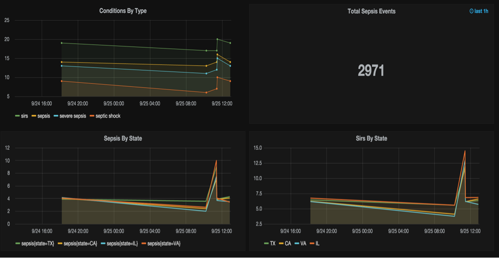 |location|MAX(evaluationDate)|SUM(sirsFlag)|SUM(sepsisFlag)|SUM(severeSepsisFlag)|SUM(septicShockFlag)|SUM(organDysfunctionSyndrome)|
