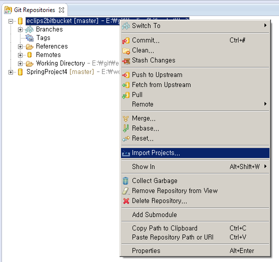 Git Repository 가 추가된 것을 확인하고, 마우스 오른쪽 컨텍스트 메뉴를 선택해서 "Import Projects"를 선택 합니다.