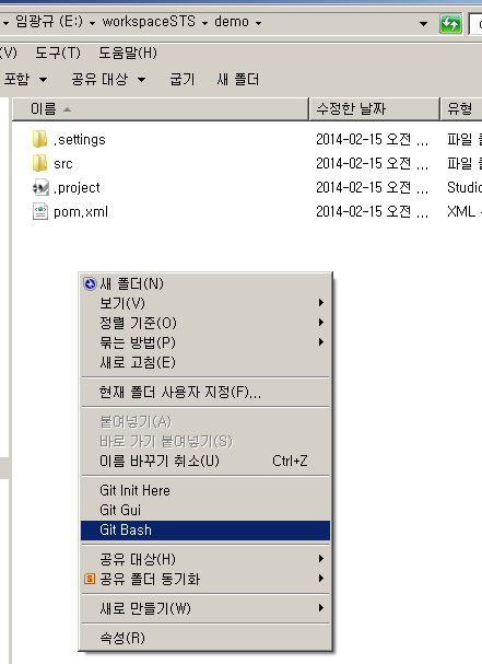그후, commit 하려는 Eclipse 프로젝트 폴더로 이동 합니다. 그후 아래와 같이 컨텍스트 메뉴에서 "Git Bash"를 선택 합니다.